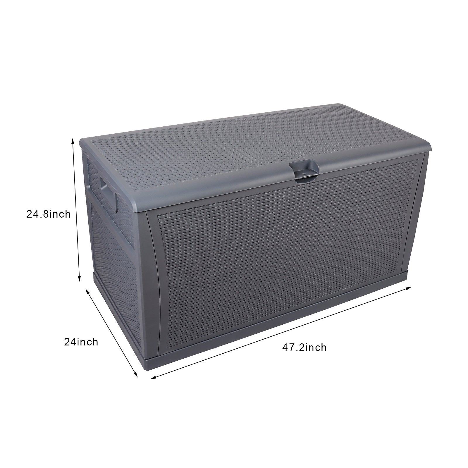 '--Constructed with weather-resistant polypropylene in wicker finish--Storage capacity equivalent to 120 Gal. or 15.9 cu. ft.--Overarching lid and lipped bin combine to inhibit water incursion--Latching mechanism keeps lid securely closed (lockable with separately-sold lock)--Safeguards patio cushions, charcoal, firewood, gardening equipment and other outdoor accessories in a moisture-free environment--Product size: 47x24x24.8 inches