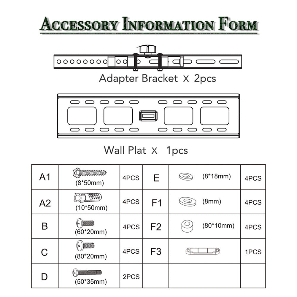 1 x standard hardware kit (screw kit is standard. Do not make sure it fits all TV models. If not, purchase a kit)