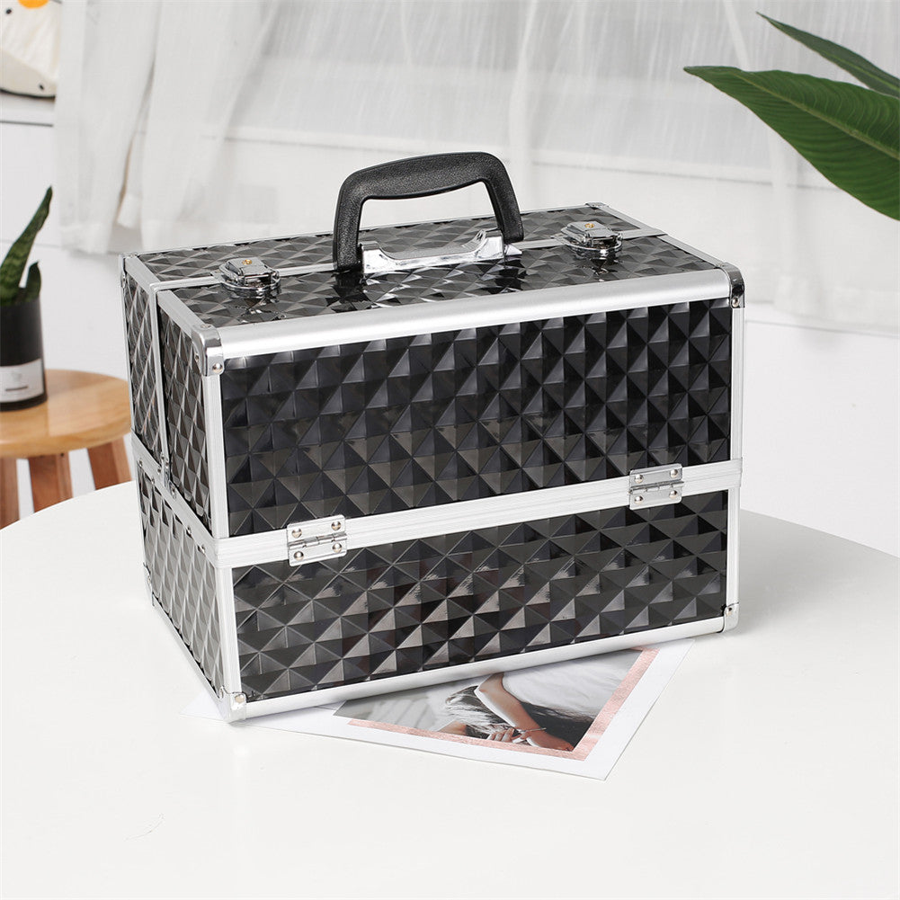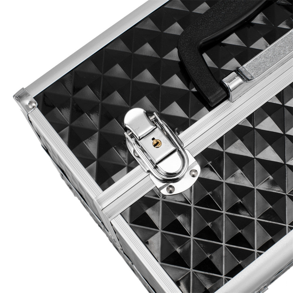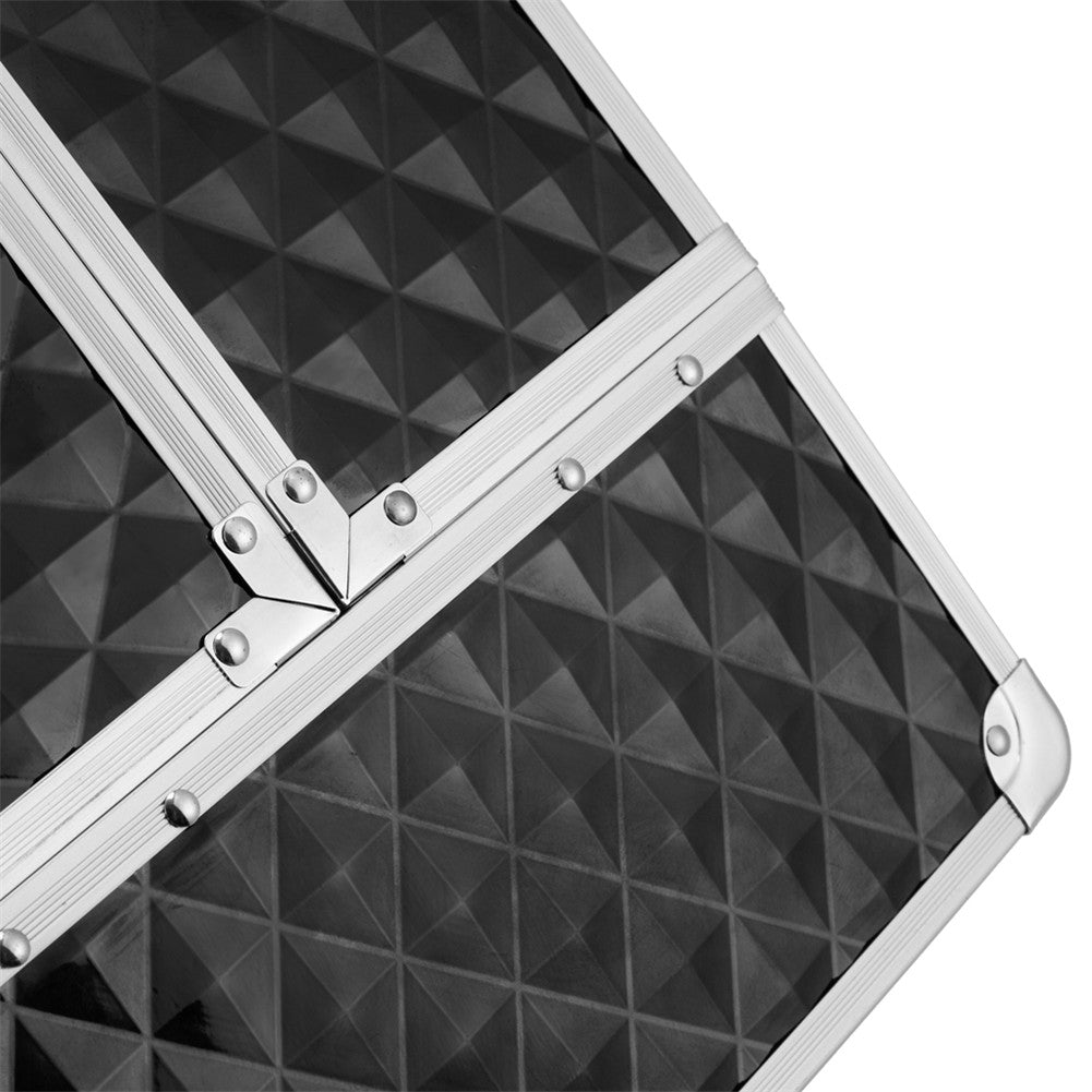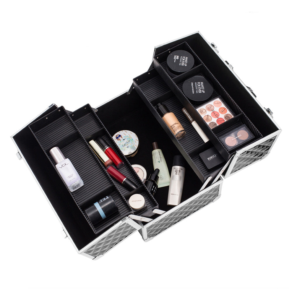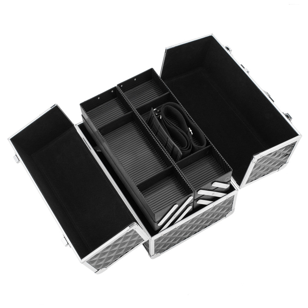 Train Case featuring 4 cantilever trays, roomy interior and locking latches. This case is great for beauty professionals and features several large compartments that are adjustable and may accommodate almost any size beauty supplies.