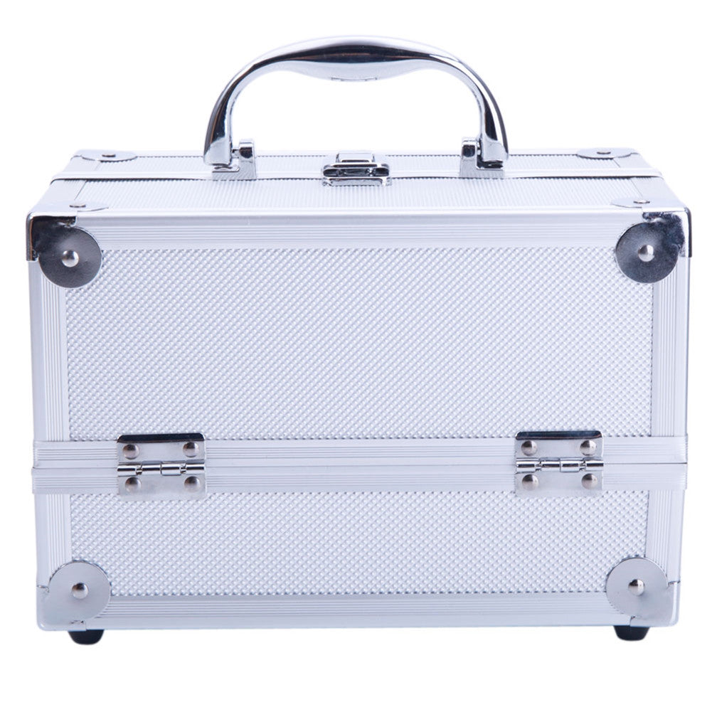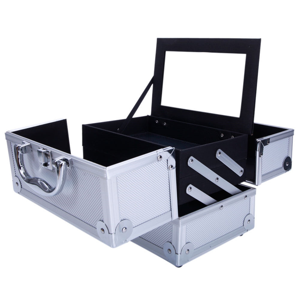 The SM-2176 Aluminum Makeup Train Case Jewelry Box Cosmetic Organizer with Mirror features accordion style fold out compartments for easy access to those of your products and tools. The compartment at the bottom of the case is perfect for storing large items. It also has a built-in mirror, which can be unfolded to the upright position for easy, on-the-go makeup applications. Aluminum frame with reinforced steel corners provides extra durability. A heavy duty handle on the top offers comfort and portability. Don't hesitate to buy now!
