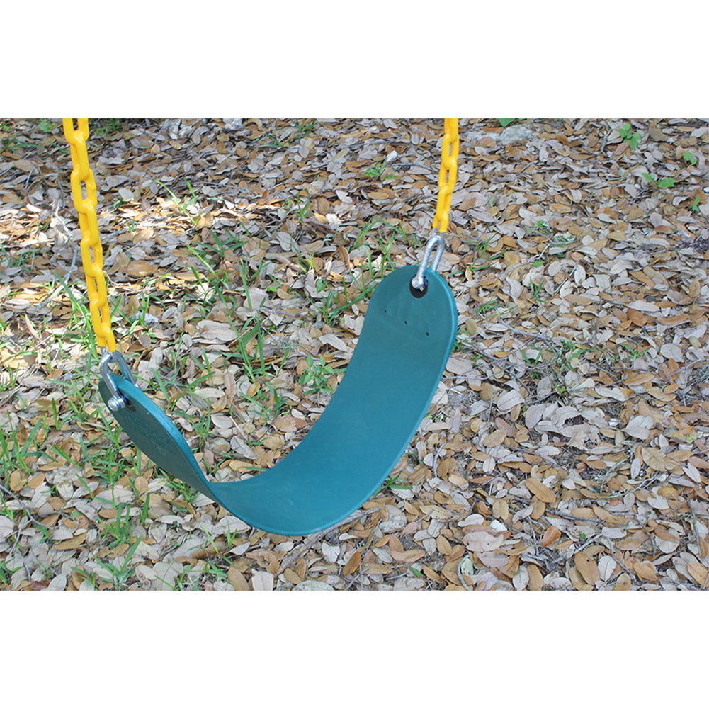 --Safe and comfortable swing seat is copolymer plastic with grommets, green seat and yellow chain