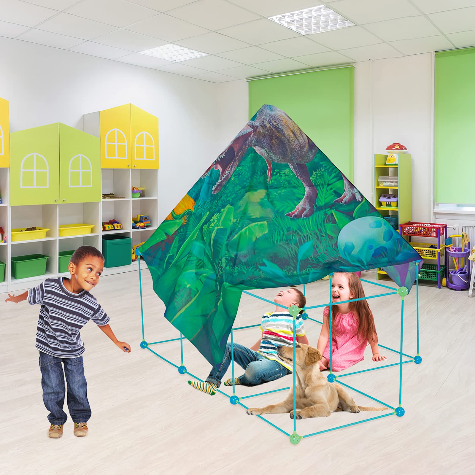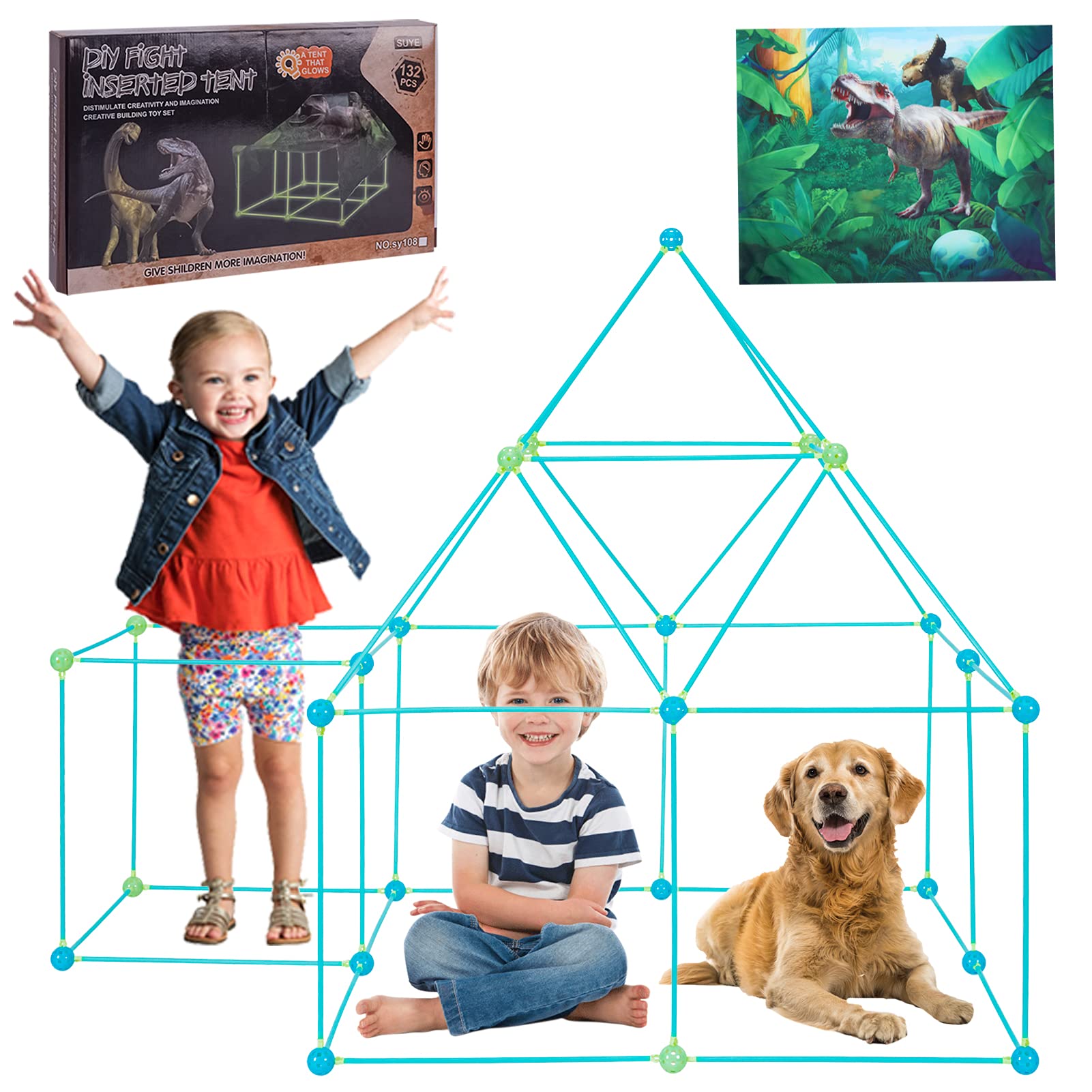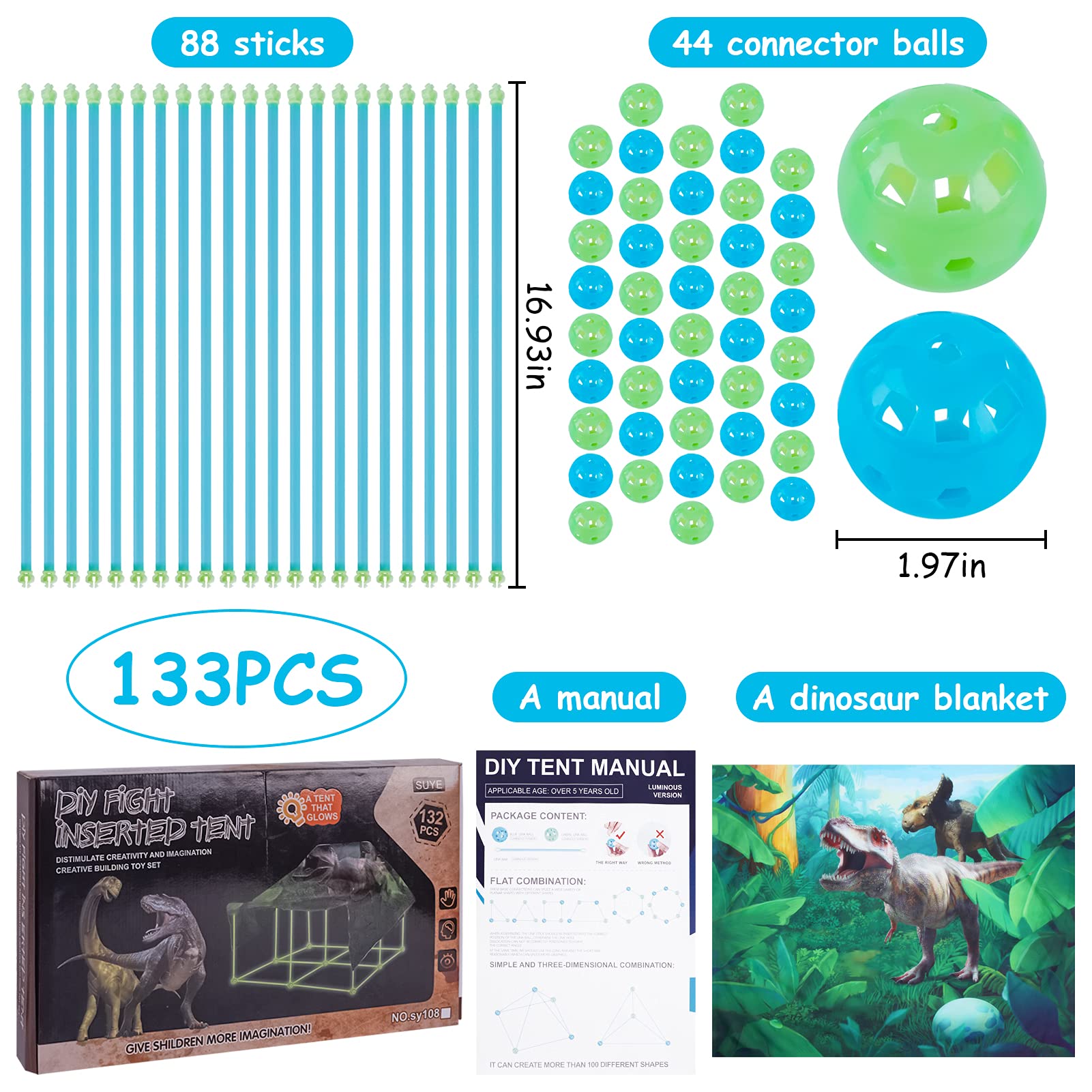 You can get not only 88 luminous connecting rods but also 44 luminous connecting balls. Magic fort also contains the essential dinosaur blanket! Note: please expose the building sticks to the sunlight for 15-30 minutes, it will emit light in the dark.