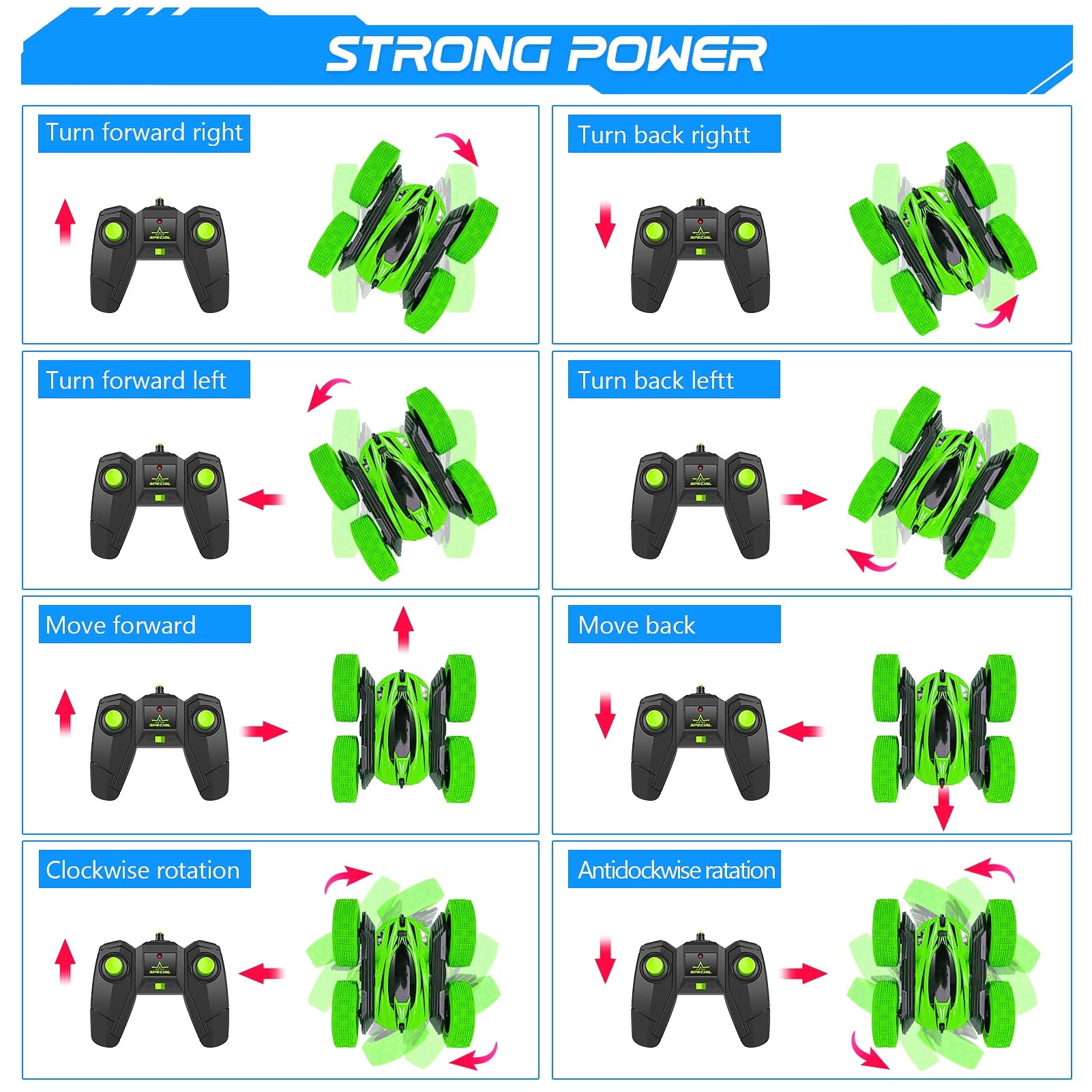 The RC Stunt cars are 4WD Off Road Vehicle, have Double Sides running, and can do 360 Degree Rotating Tumbling and 3D Deformation, with forward, backward, turn left, turn right functions. suitable for your kids or toy car Lovers.