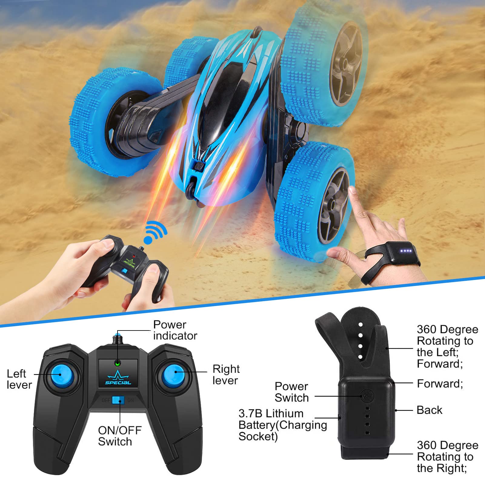 These remote control cars provided two control methods,2 smart gesture remote and 2 remote control handle,the RC car sets comes with the newest watch controller that are based on gravity, kids can control the stunt vehicle via swing their hands. It can offer a stable signal and it has a non-jamming function that allows multiple users to play at the same time.