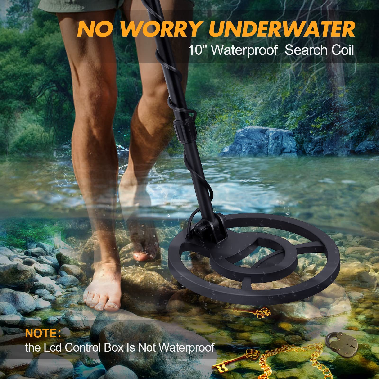 The Metal detector for adults features a 10 inches search coil, so you can search larger areas faster. IP68 waterproof function enables the metal detector works well underwater, such as on the beach, in the river etc.. (Note: the control box is not waterproof).