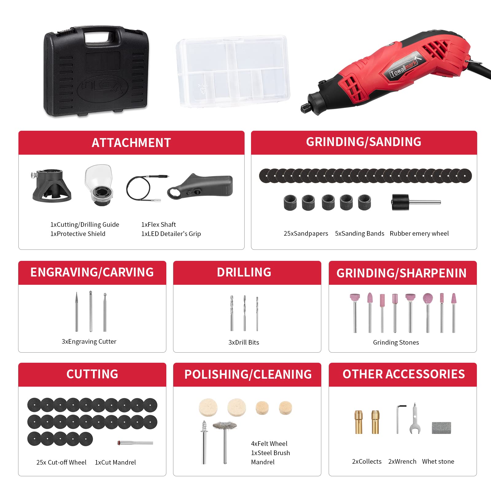 | Package Contents | 1 ¡Á Towallmark Rotary Tool; 1 ¡Á Cutting Guide; 1¡Á LED Detailer's Grip; 1 ¡Á Cover Shield;1 ¡Á Flex Shaft |