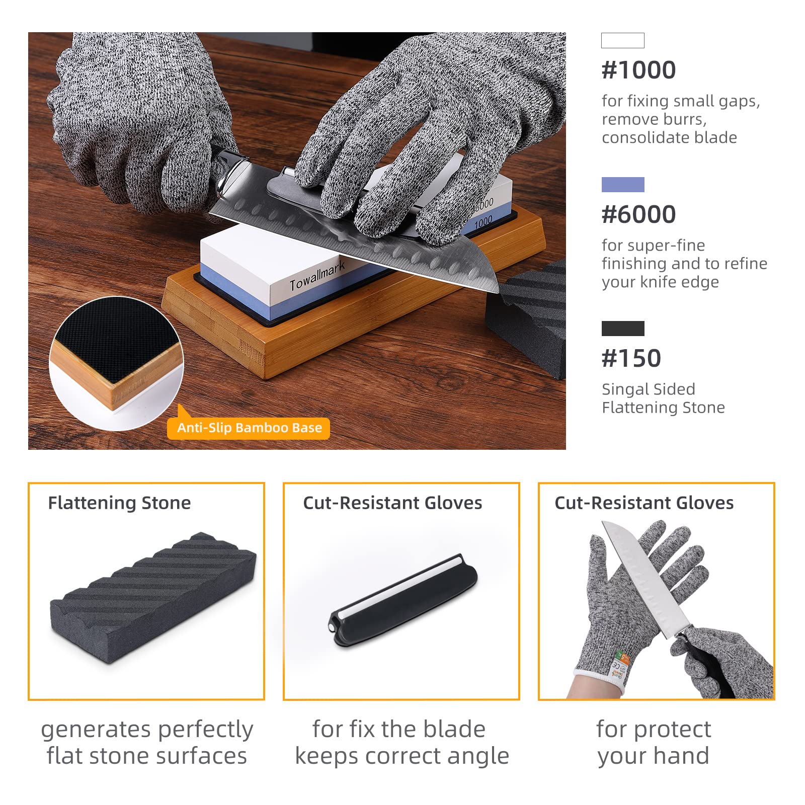 | Package Contents | 1 x Double Sides Grit Sharpening Stone 1000/6000 1 x Flattening stone 1 x Angle Guide 2 x Anti-cut Gloves 1 x Bamboo base |