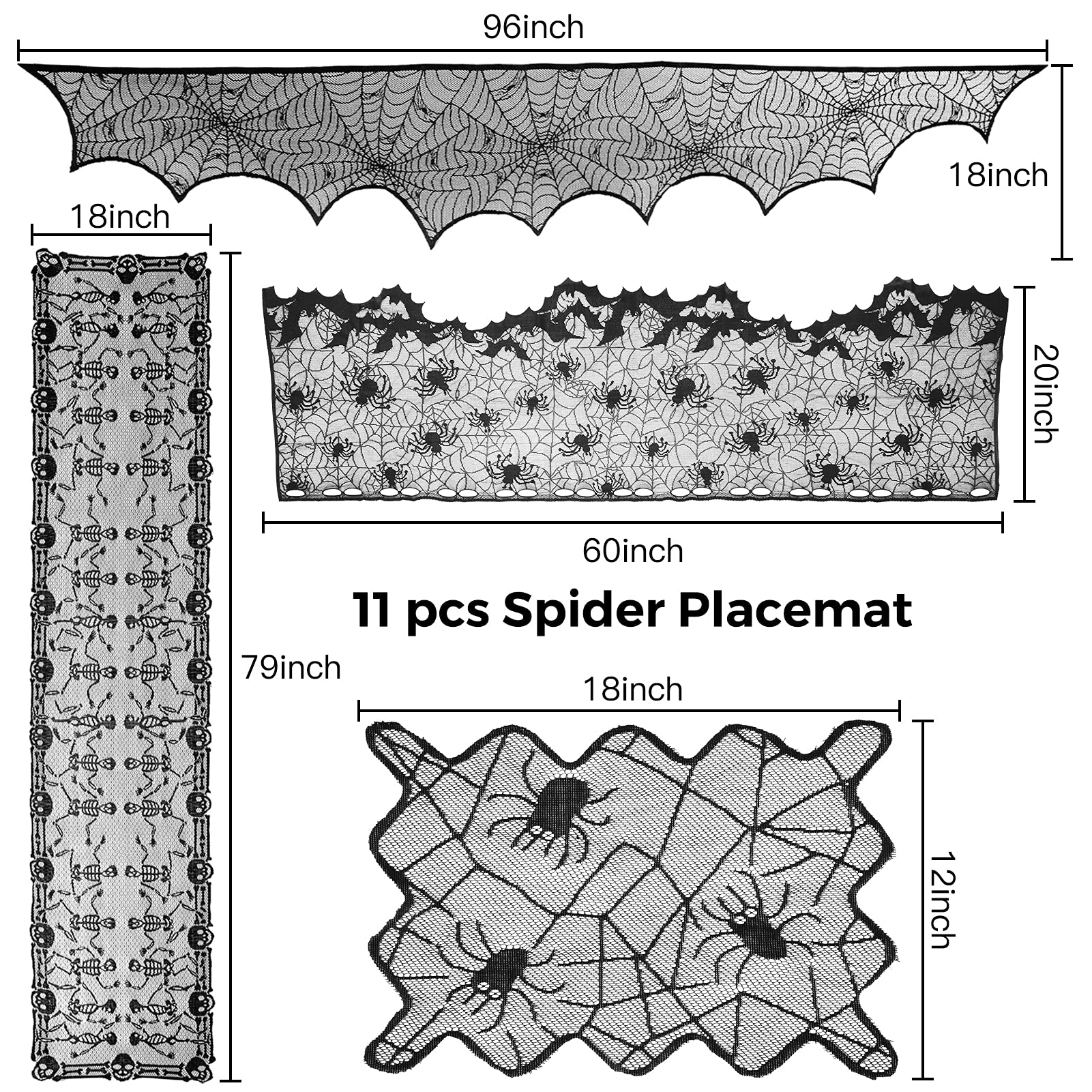 Product sizes: fireplace scarf cover is 18*96 inch;spiderweb tablecloth 18*79 inch, cobweb lampshade 20*60 inch, spider placemat is 12*18 inch.