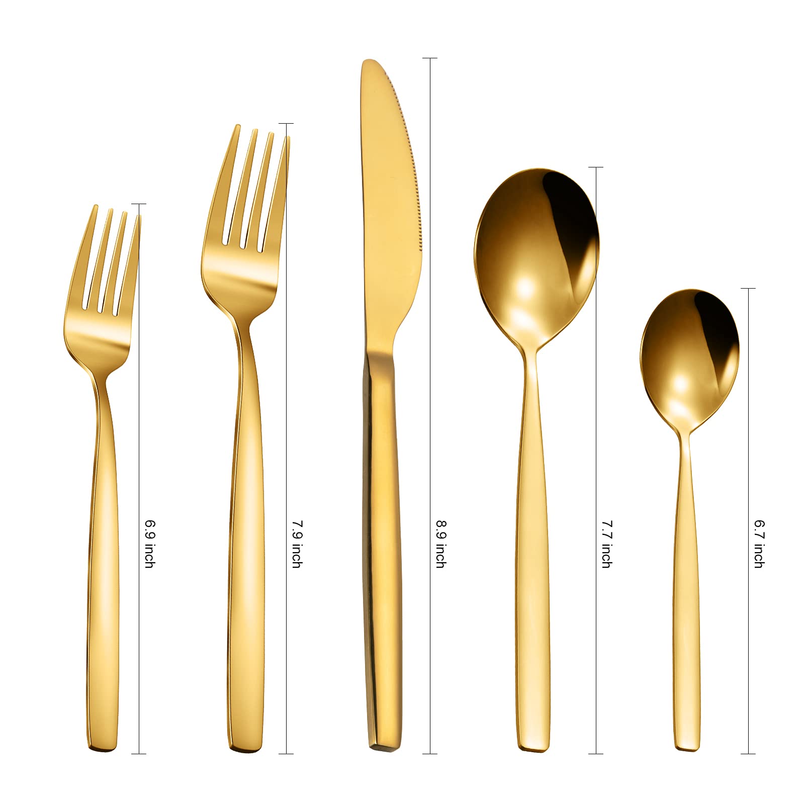 20-piece flatware set for 4 8.9-Inch Dinner Knife x 4 7.9-Inch Dinner Fork x 4 7.7-Inch Dinner Spoon x 4 6.9-Inch Salad Fork x 4 6.7-Inch Tea Spoon x 4 |