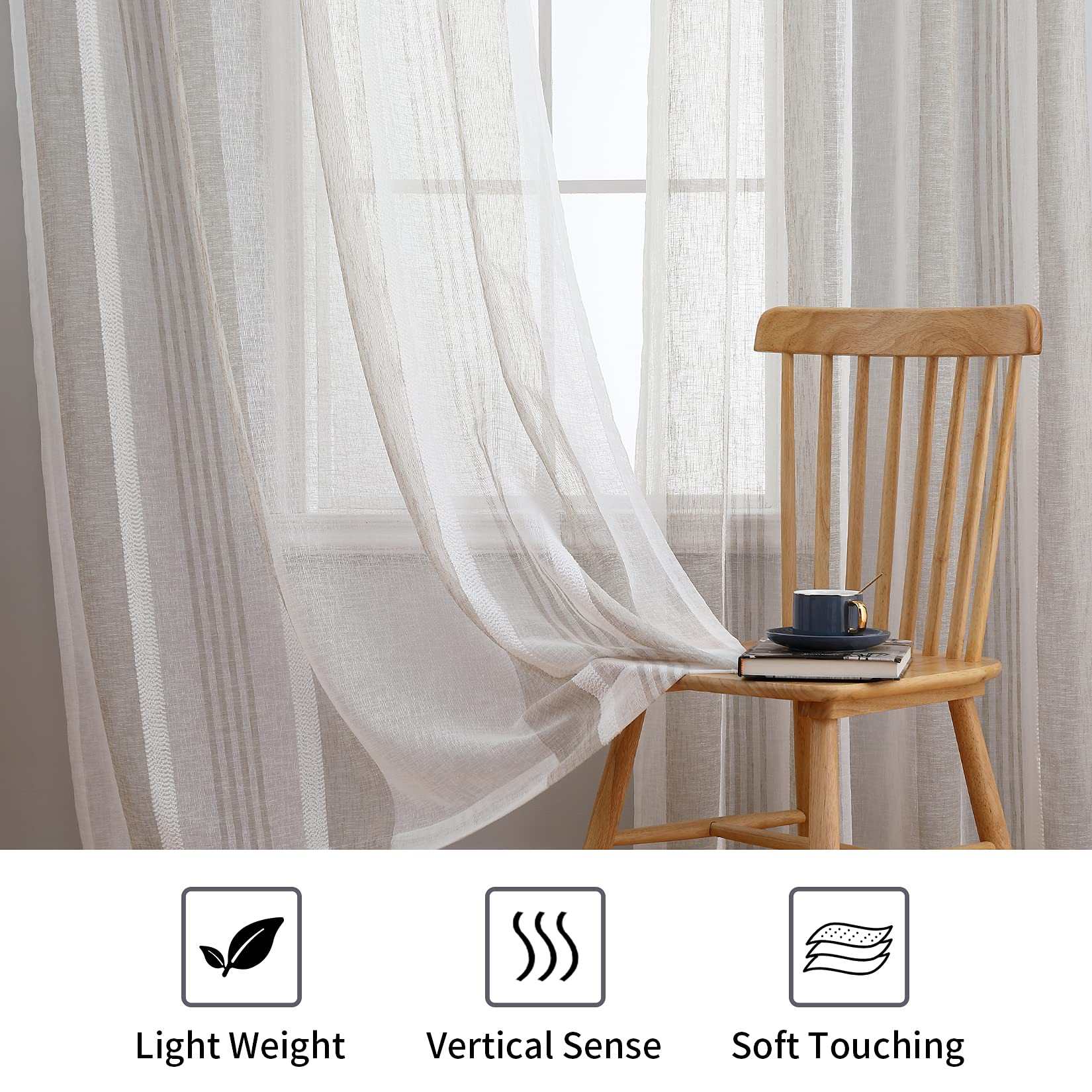 Our sheer curtains are made of premium faux linen textured fabric allows the curtains natural down, the yarn dyed weaving technology makes a double sided fabric, brings you the elegant and natural feeling, adds comfortable atmosphere into your room.