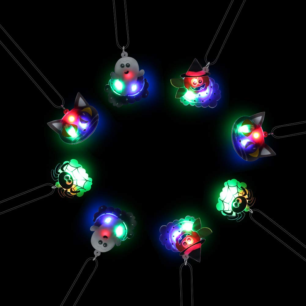 Have Fun Halloween: These Halloween rings and necklaces are designed with LEDs, and you can put them on fingers, hair, as table or wall lights, cake decorations and any thing that you want to light up.Assorted Halloween styles to satisfy your needs: pumpkins, bat, solo-eye, spiders, pirate and so on.