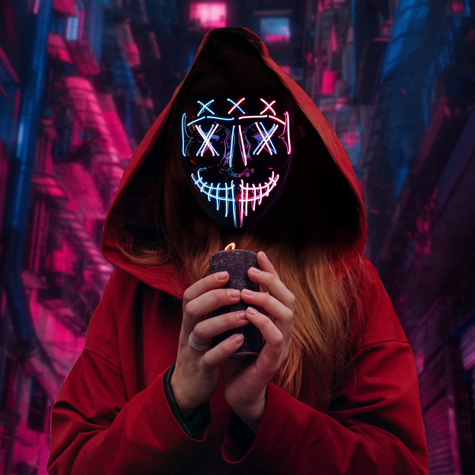 ??ADJUSTABLE BAND?? --The Halloween purge mask is designed with an adjustable strap, allows you to easily adjust the mask for small, medium, large size heads to place around you head in order to hold it in place. Our light up mask also has openings in the eye, nose and mouth area, comfortable to wear for long time. The light up halloween mask fits for most adult and kids face.