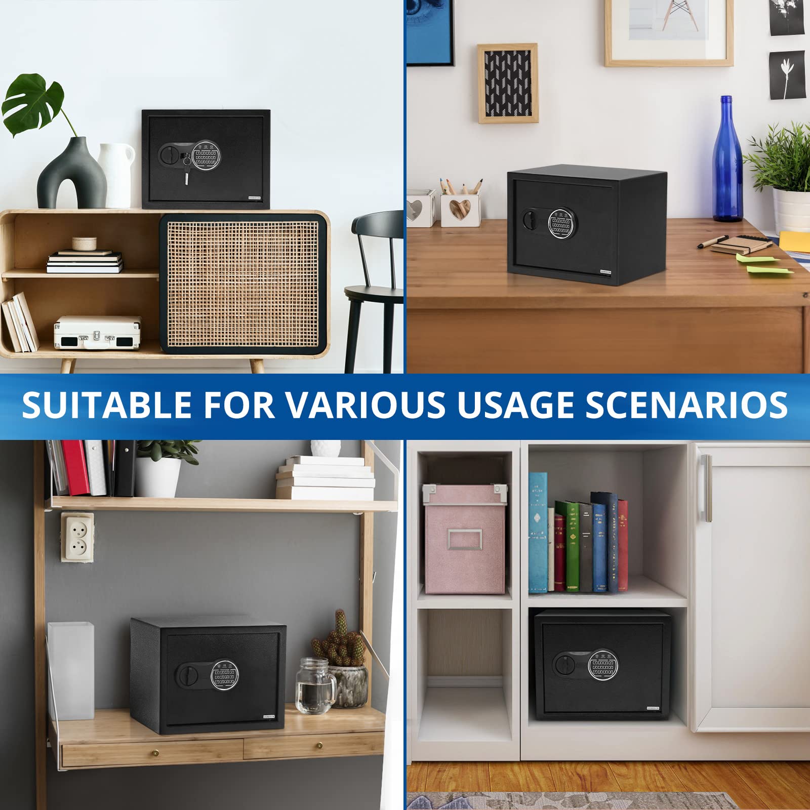 Adjustable/Removable interior shelf. Safe is not fireproof or waterproof. ft enough space to fit documents, cash, jewelry, and more private items, you will have no worries about space.