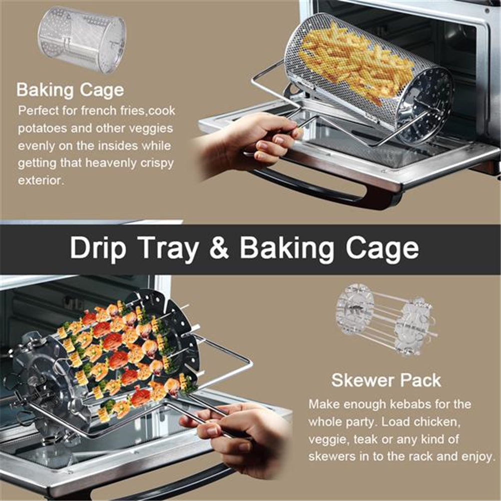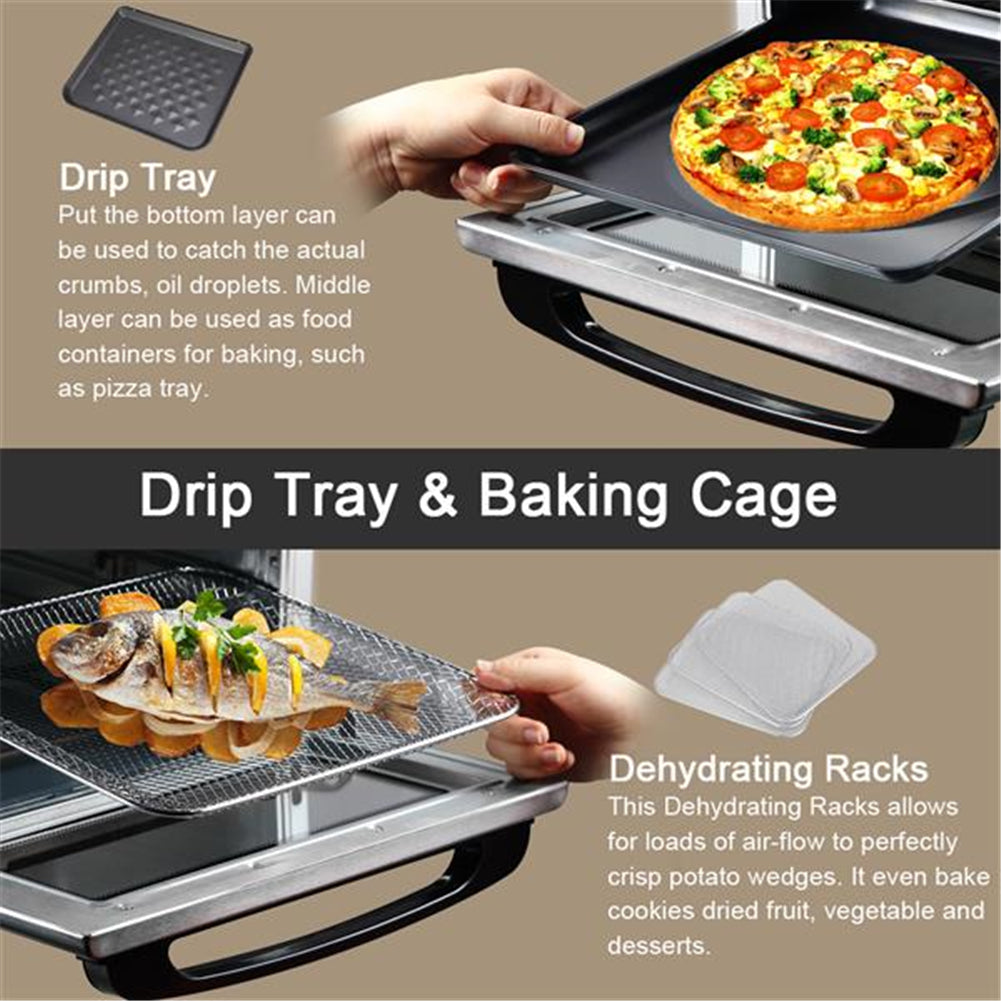 8 accessories allow you to do more than fry, one of the best parts about the air fryer oven is its versatility. With the 8 included accessories, each deluxe air fryer oven comes with a fry pan (drip tray), three fry net, chicken fork, rotating basket, skewer rack, fetch rack.