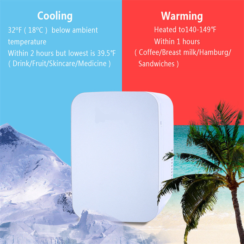 --Refrigerate and heat. The mini fridge has a switch function from heating to cooling. Cooling Capacity: 64.4oF below ambient temperature. Heating Capability: 140oF-149oF. When cooling, the green indicator light is on, when heating, the red indicator light is on