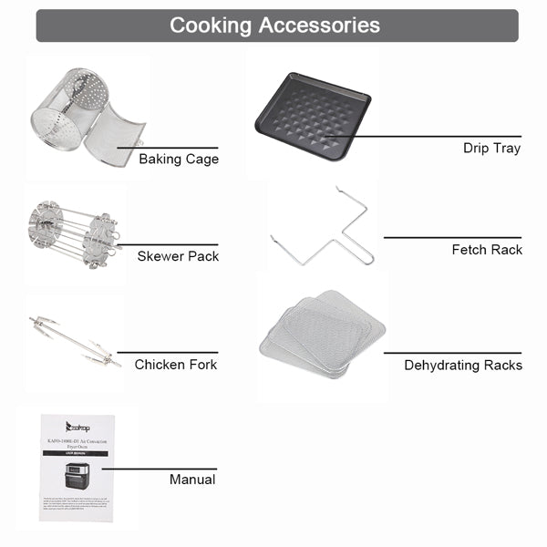 3. 8 Accessories allow you to do more than fry , one of the best parts about the Air Fryer Oven is its versatility. With the 8 included accessories, each Deluxe Air Fryer Oven comes with a Fry Pan (Drip Tray) , three Fry Net, Chicken Fork , Rotating Basket , Skewer Rack , Fetch Rack