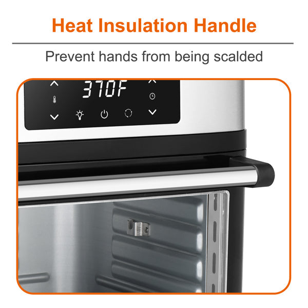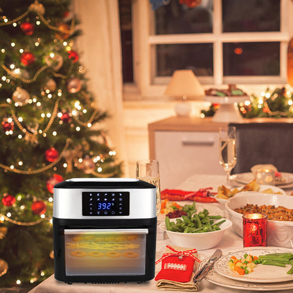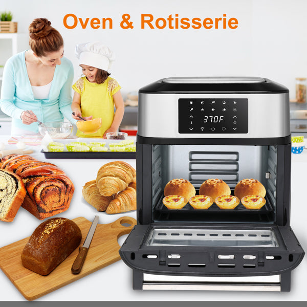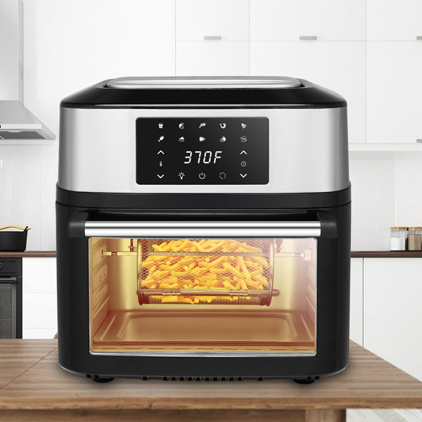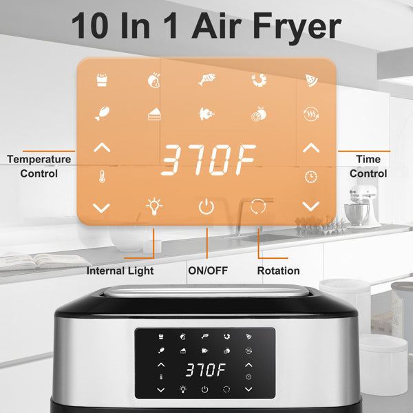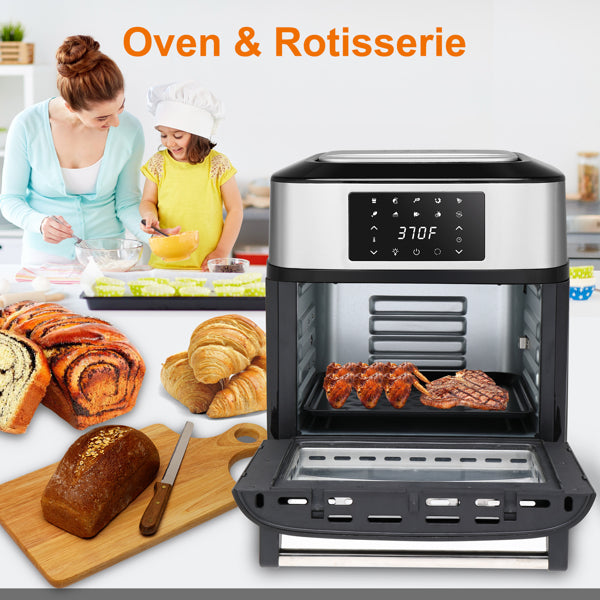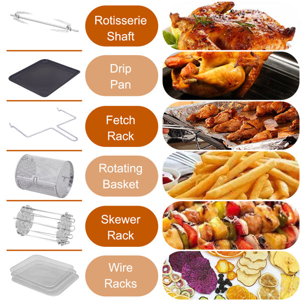 All-in-One Air Fryer, Oven, Rotisserie, and Dehydrator With the Large Air Fryer you are on your way to healthy eating without sacrificing on taste or flavor. Cook, fry, grill and bake without the need for butter, oil or other unhealthy fats. With Rotisserie Chicken Fork, it could cook 3kgs( 6pounds ) Chicken with crisp outside and juice inside. Each Deluxe Air Fryer Oven comes with a fry pan (drip tray), three fry net, chicken fork , rotating basket , skewer rack , fetch rack. Double layer window with inside glass and outside transperant PC. Power Lighting inside, give you a good vision and cool touch.