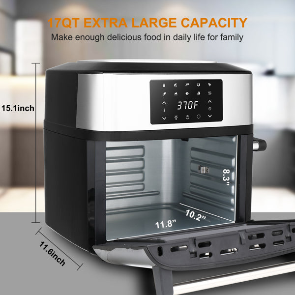 1. Extra Large Cooking Capacity , 16.91 quarts of cooking space makes this air fryer one of the largest on the market, while still being compact enough to fit easily on your counter top.With Rotisserie Chicken Fork, it could cook 3kgs( 6pounds ) Chicken with crisp outside and juice inside