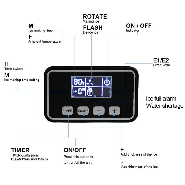 2.¡¾LCD & Digital display¡¿Electronic controls for ease of use. Features an easy-to-read push-button digital design for a comfortable use. Timer with up to 8-hour delay. Offers on-time ice production. When there is not enough water in the water tank, the indicator will light up, reminding you to add more water. Or when the ice bucket is full, the ice maker it will remind you to remove the extra ice cubes, so the ice maker can start to make more ice