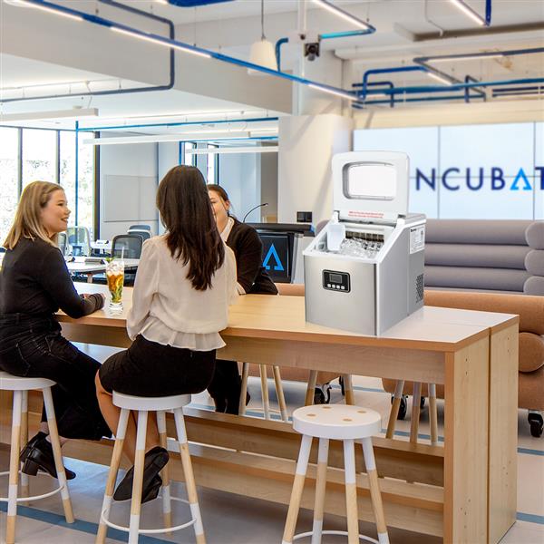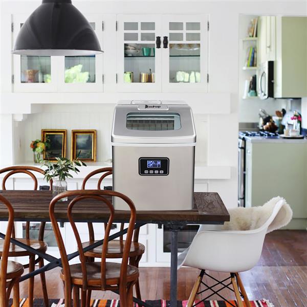 Free standing design stainless steel portable ice maker allows versatile placement. Idea for you home, office, kitchen, bar or coffee shop. The removable ice basket stores up to 2.87 lbs. of ice at a time, ensuring that you have ice ready whenever you need it, and it comes with an ice scoop to facilitate ice removal. It's easy to clean, use, control and transport. For best results, keep tabletop ice maker machine upright for at least 24 hours before first using it.
