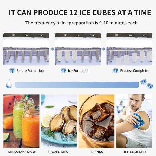 1. High-Quality Ice Cubes£ºCountertop ice maker machine can produces 12 ice cubes per cycle (every 9-10 minutes). That means you can make up to 44 pounds of ice cubes every 24 hours. Best of all, you can adjust the thickness of the ice cubes according to your needs, letting you create perfect drinks