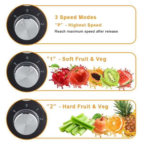 "1" is low speed, for soft fruits vegetables like oranges, watermelon, tomato, etc ; "2" is high speed, for hard food like apple, celery, ginger, etc. "P" is highest speed(Reach maximum speed after release). Design with anti-drip function, no need to worry about juice spilling everywhere