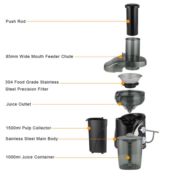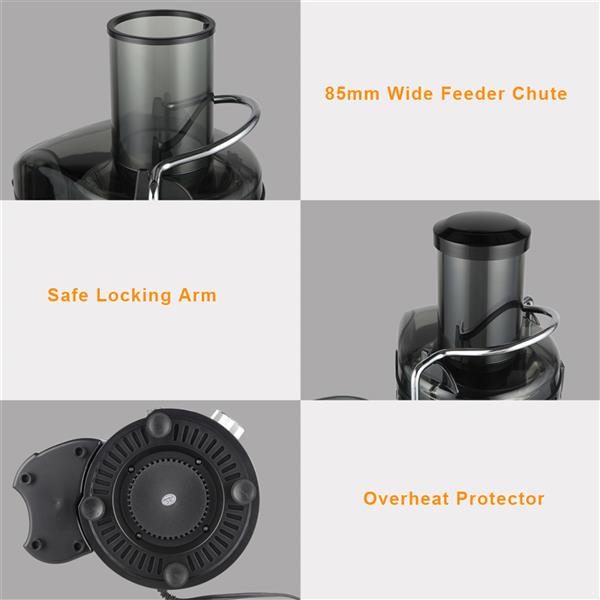3.3 inch feed chute, entire apple or pear can be put in for juicing (small size fruit), no cutting apart needed. Food grade stainless steel cutting dis, extract higher juice yield and less foaming
