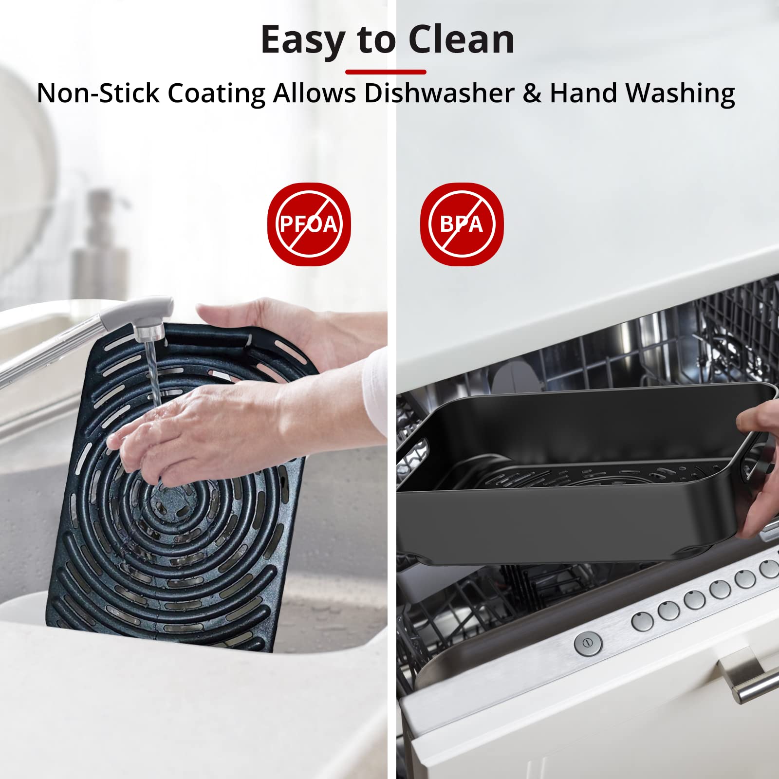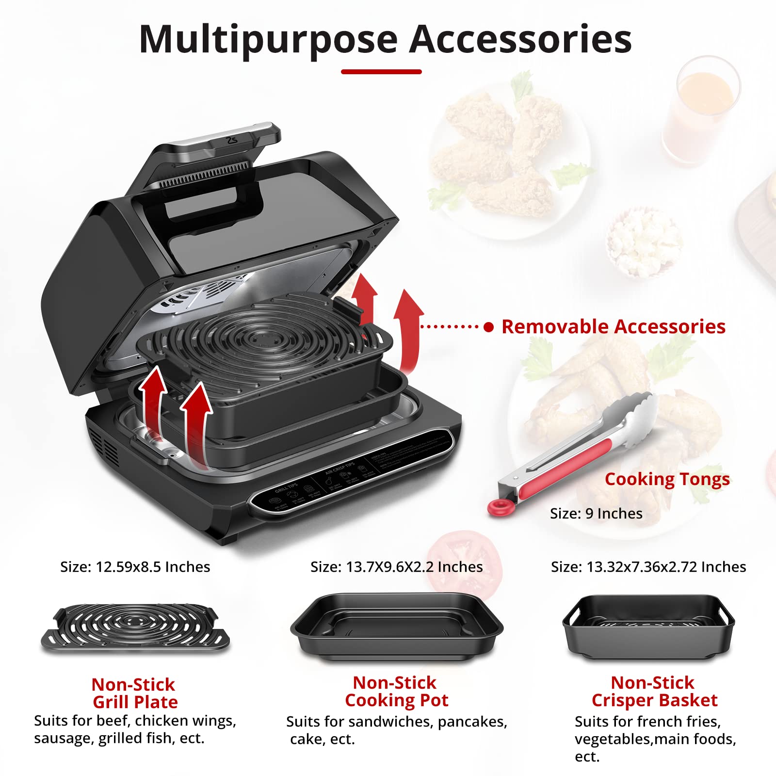 Expanded Cooking Options The air fryer grill comes with 4 Non-stick accessories, allowing you to bake, air fry, roast, grill, etc., also, a cooking tong is considerately included for you to pick hot items. |
